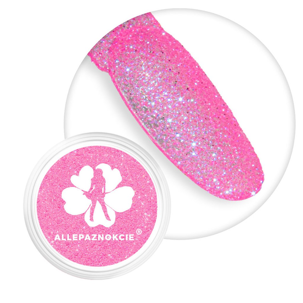 Třpytky na nehty v krásné jasně růžové barvě. Šroubovací uzávěr. Možné aplikovat do laku i UV gelu. Možné použít i na zdobení těla nebo vlasů.