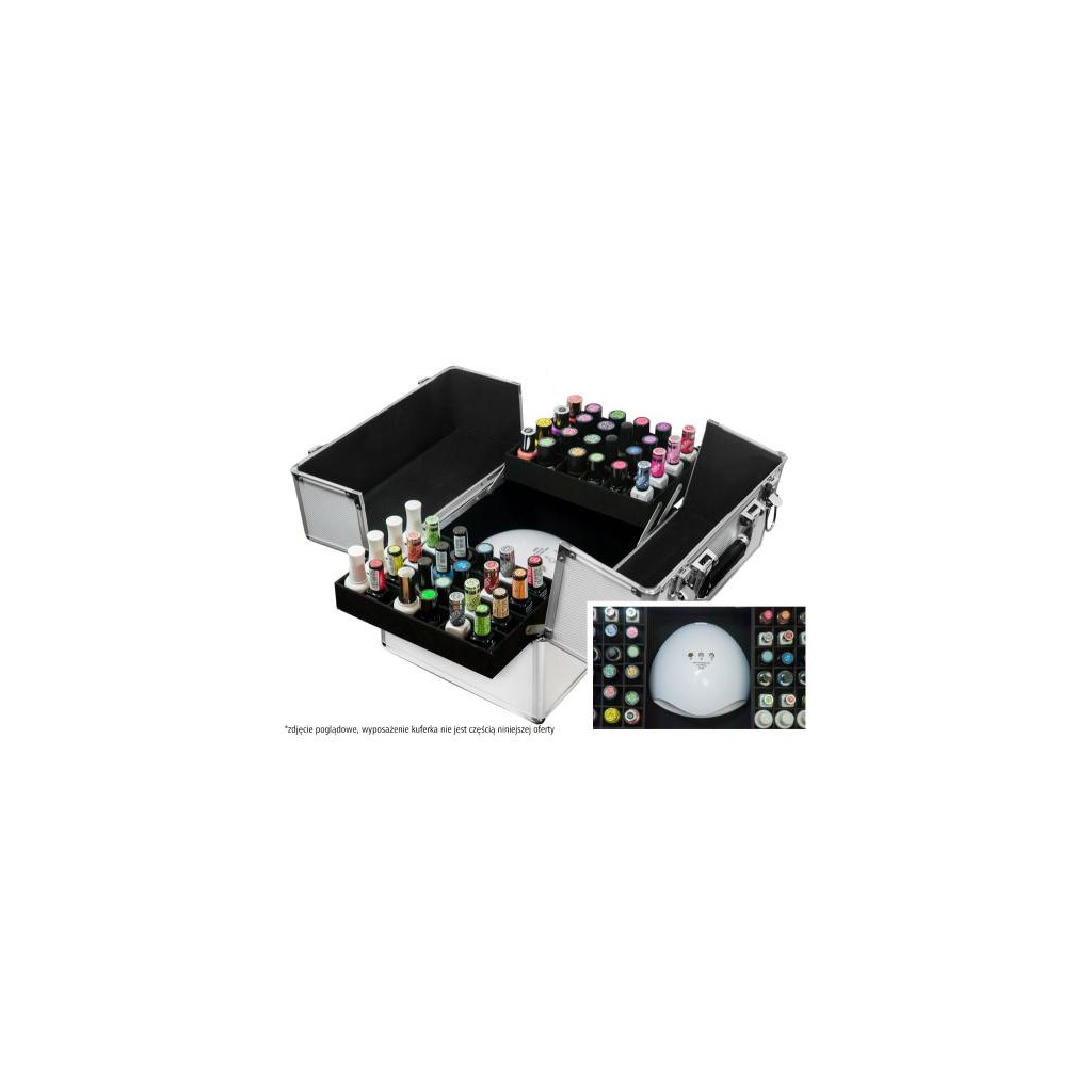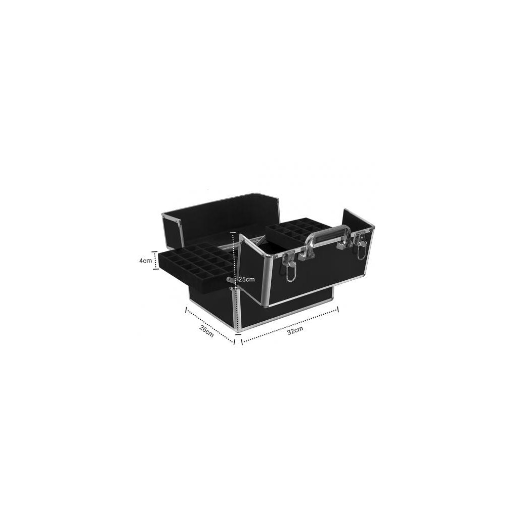 Perfektní pro mobilní kosmetičky i pro skladování kosmetiky doma. Do kufříku se vejde vše, co potřebujete ve svém mobilním nehtovém studiu. Má praktické přihrádky na laky na nehty (celkem 48 kusů), které lze vyjmout. Ve spodní části pojme UV lampu, malou frézku a další příslušenství.