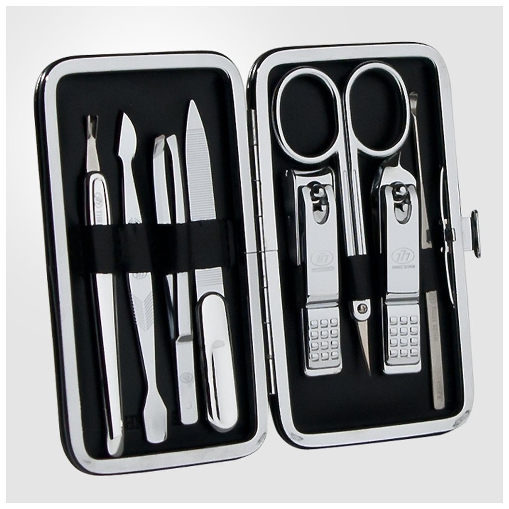 Sada obsahuje: 2x štípátko na nehty, pinzeta manikúrní zkosená, nůžky na kůži, pilník, manikúrní tyčinka, zatlačovač a seřezávač kůžičky